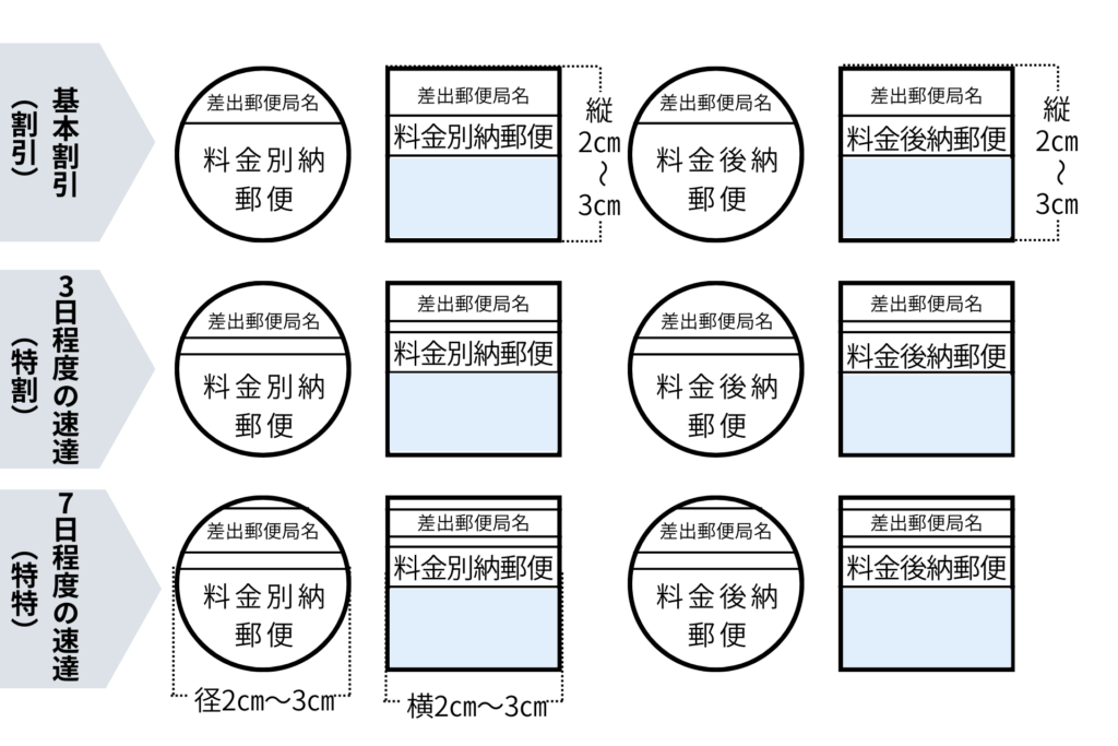 - 通常配送(猶予なし): 「局名」と「後納・別納の表記」の間に1本の線を引く