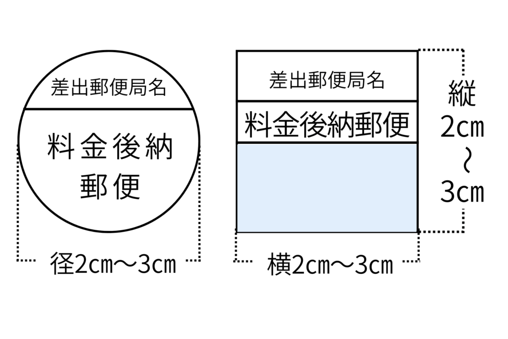 料金後納で郵便物を差し出す際は、切手の貼付に代わり、規定のサイズ・形式に沿った表示を表面の所定位置(縦長封筒は左上、横長は右上)に印字する必要があります。この表示には「円形」と「四角形」の2つの規格が用意されており、企業の運用スタイルに合わせて選択が可能です。